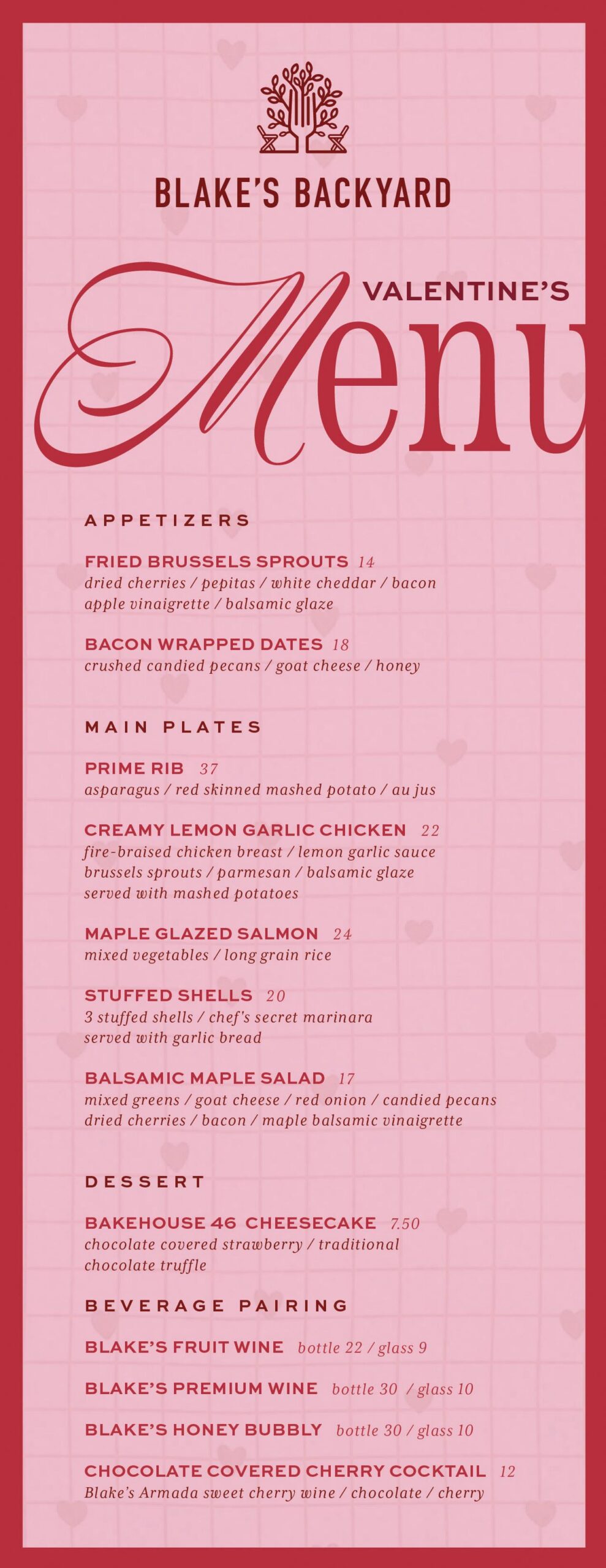 This Valentine’s Day, trade the rush for a cozy night at Blake’s Backyard. Sip, share, and savor a dinner for two in our greenery-filled taproom, glowing with winter warmth and twinkle lights. Our kitchen is serving up Valentine’s specials made for lingering, laughing, and falling a little more in love.