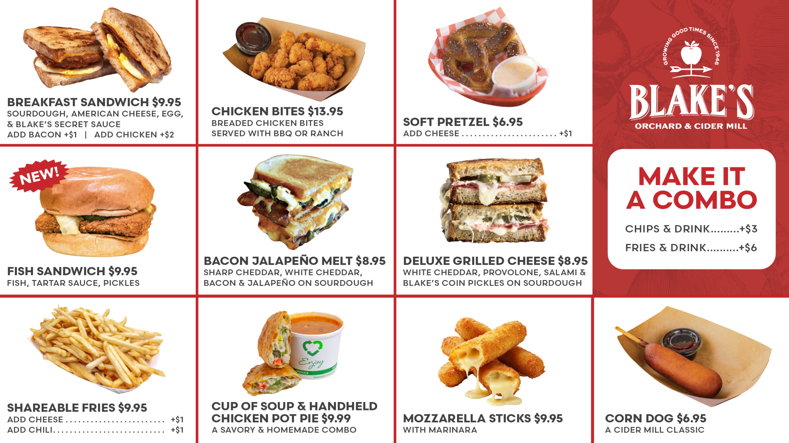We do have multiple spots on our property to eat including Blake’s Tasting Room, Blake’s Grill located inside the Cider Mill and many other food & beverage stands open seasonally including Orchard Cafe, Snack Shack, Graze Farm Kitchen, and Blake’s Burger Tent.