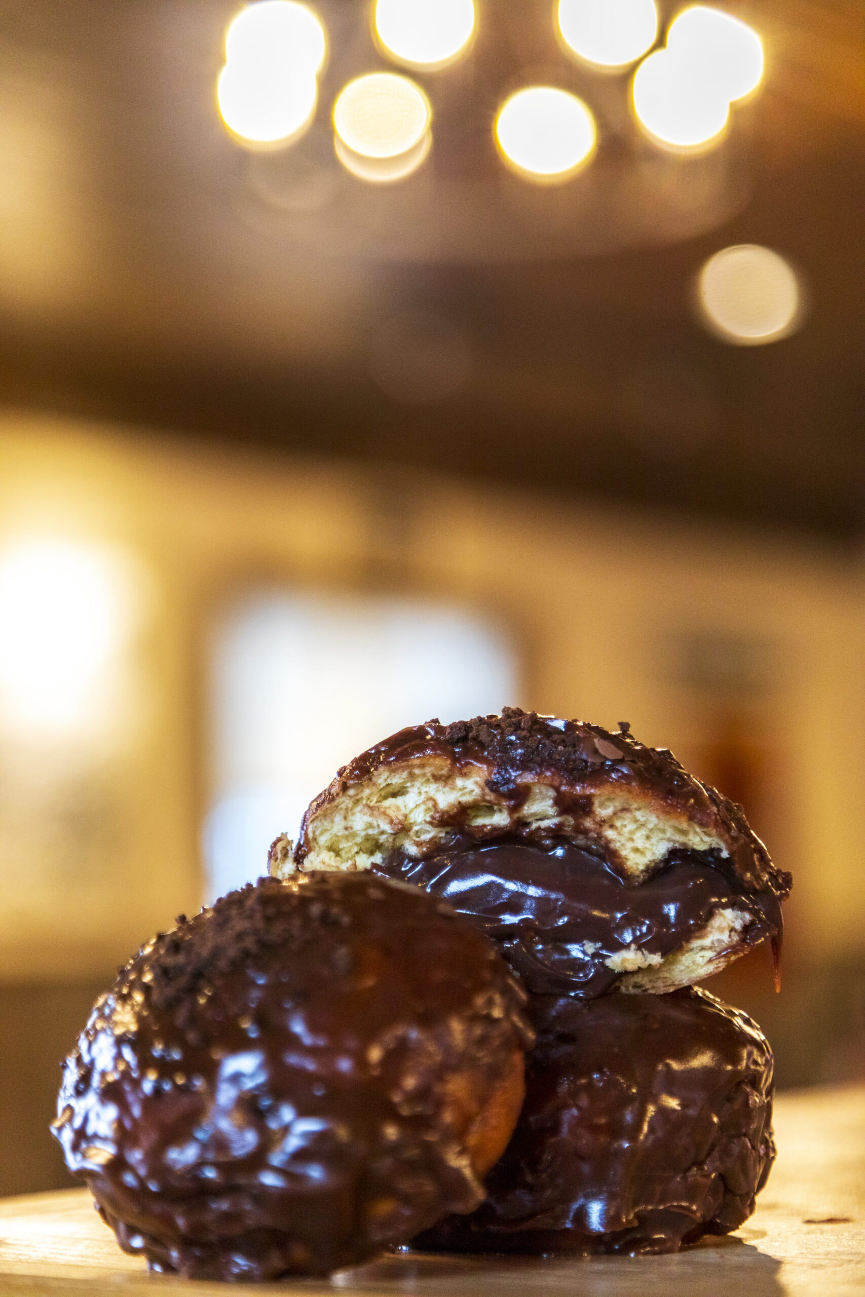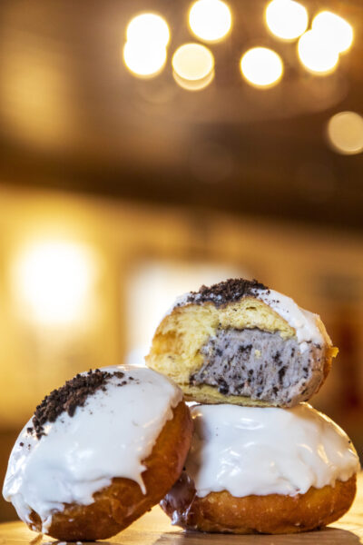 Marshmallow cream–filled pączki dipped in chocolate glaze and finished with graham cracker crumble.